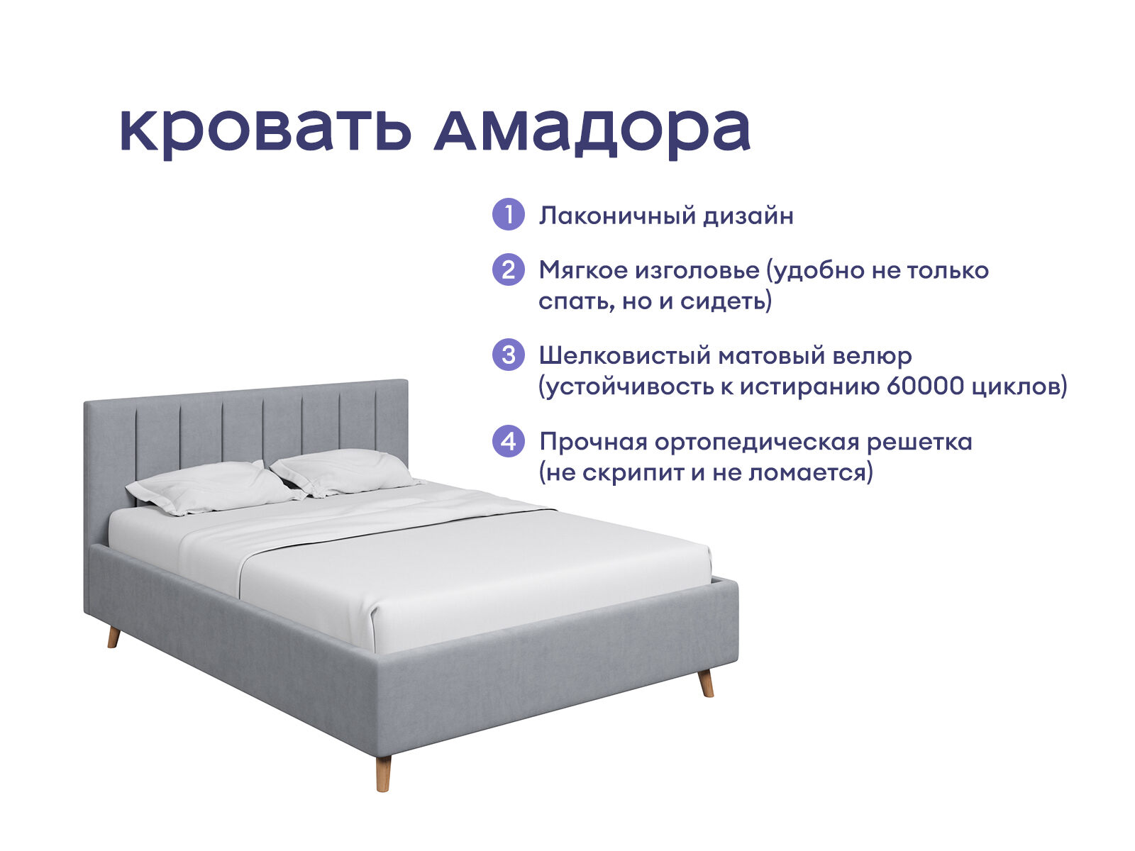 Кровать получила лёгкий и элегантный дизайн. Изголовье с мягкими вертикальными секциями украсит любую спальню и добавит уюта месту отдыха. Изящные наклонные ножки из дерева визуально облегчают конструкцию и обеспечивают просвет над полом, где легко пройдёт робот-пылесос. Корпус кровати выполнен из ДСП. Для обивки кровати используется велюр – мягкий и бархатный материал, который предпочитают ценители нежных прикосновений. В комплект входит ортопедическое металлическое разборное основание.