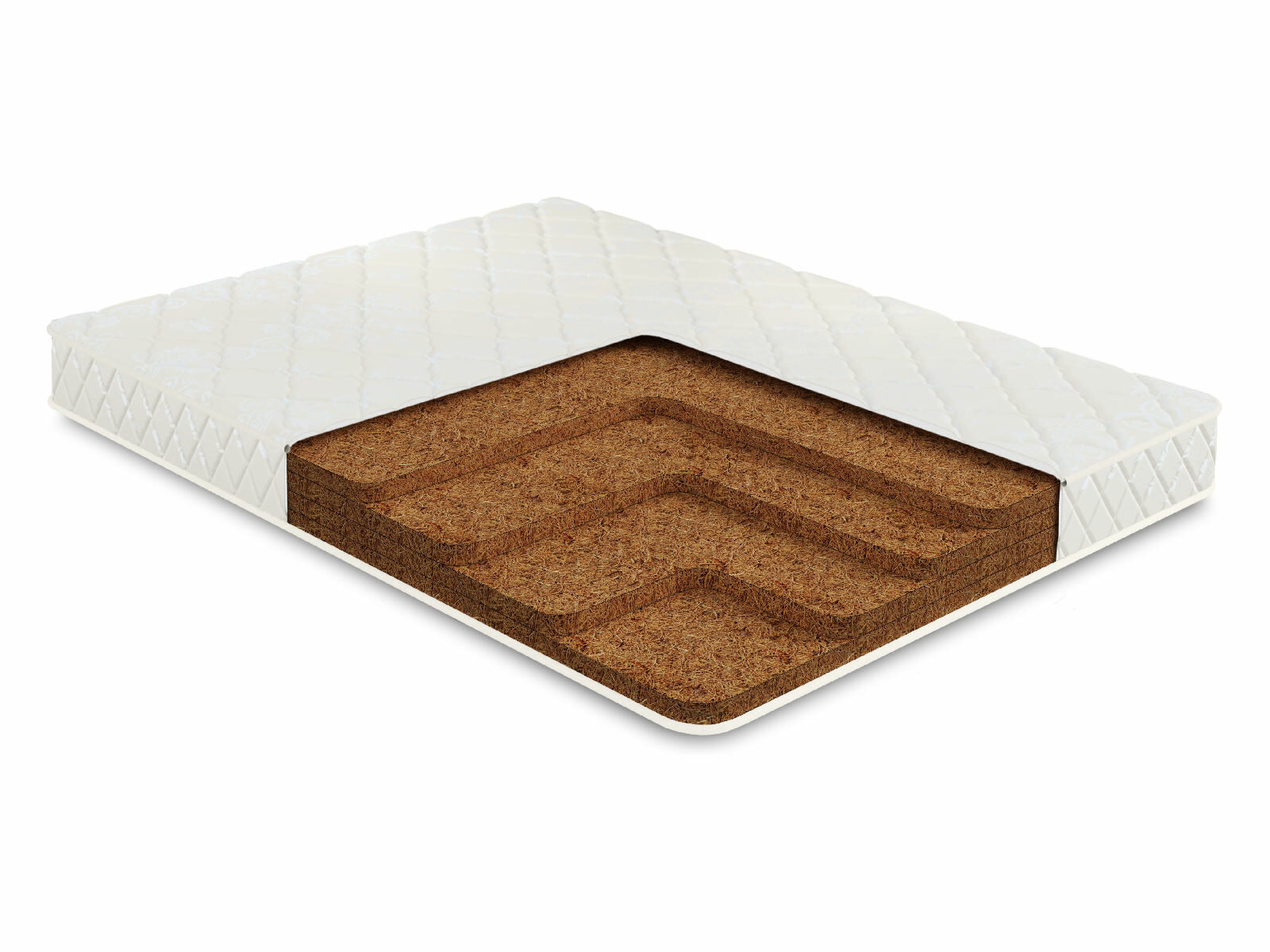 Койра – это материал с природными составляющими в основе. Она состоит из кокосового волокна, которое плотно прессуют, а затем дополнительно скрепляют латексным составом. Так кокос приобретает не только жёсткость, но и гибкость, которая позволяет ему подстраиваться под формы фигуры человека. Вот почему этот материал обладает ортопедическим эффектом и, несмотря на твёрдость, великолепно повторяет изгибы тела.