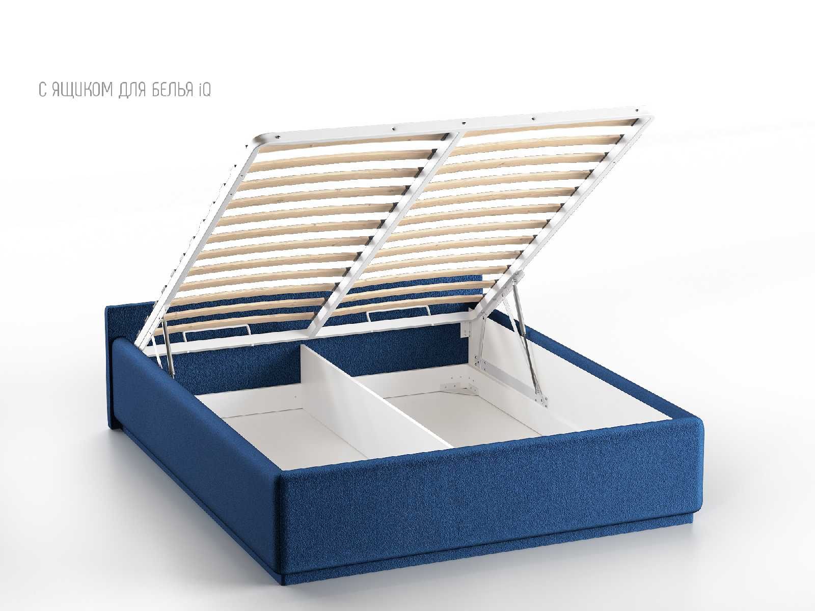 Кровать укомплектована IQ с подъемным механизмом и ящиком для белья без дна (дополнительная платная опция - дно к ящику IQ из HDF (ХДФ). Каркас кровати на цоколе, декоративный чехол на цоколе съёмный. Глубина ящика для белья - 30 см, без ограничения нагрузки на ящик.