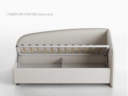 Кровать укомплектована IQ с подъемным механизмом и ящиком для белья без дна (дополнительная платная опция - дно к ящику IQ из HDF (ХДФ). Каркас кровати на цоколе, декоративный чехол на цоколе съёмный. Глубина ящика для белья - 30 см, без ограничения нагрузки на ящик.