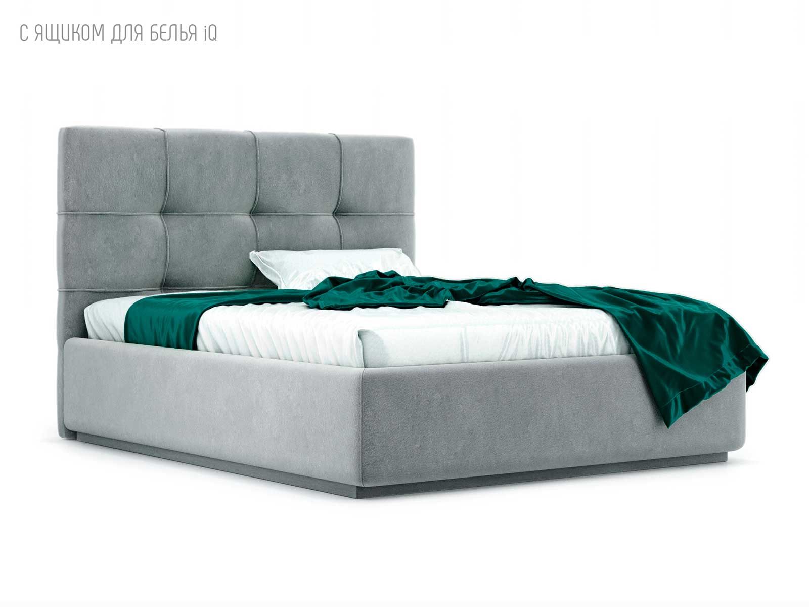 Кровать укомплектована IQ с подъемным механизмом и ящиком для белья без дна (дополнительная платная опция - дно к ящику IQ из HDF (ХДФ). Каркас кровати на цоколе, декоративный чехол на цоколе съёмный. Глубина ящика для белья - 30 см, без ограничения нагрузки на ящик.
