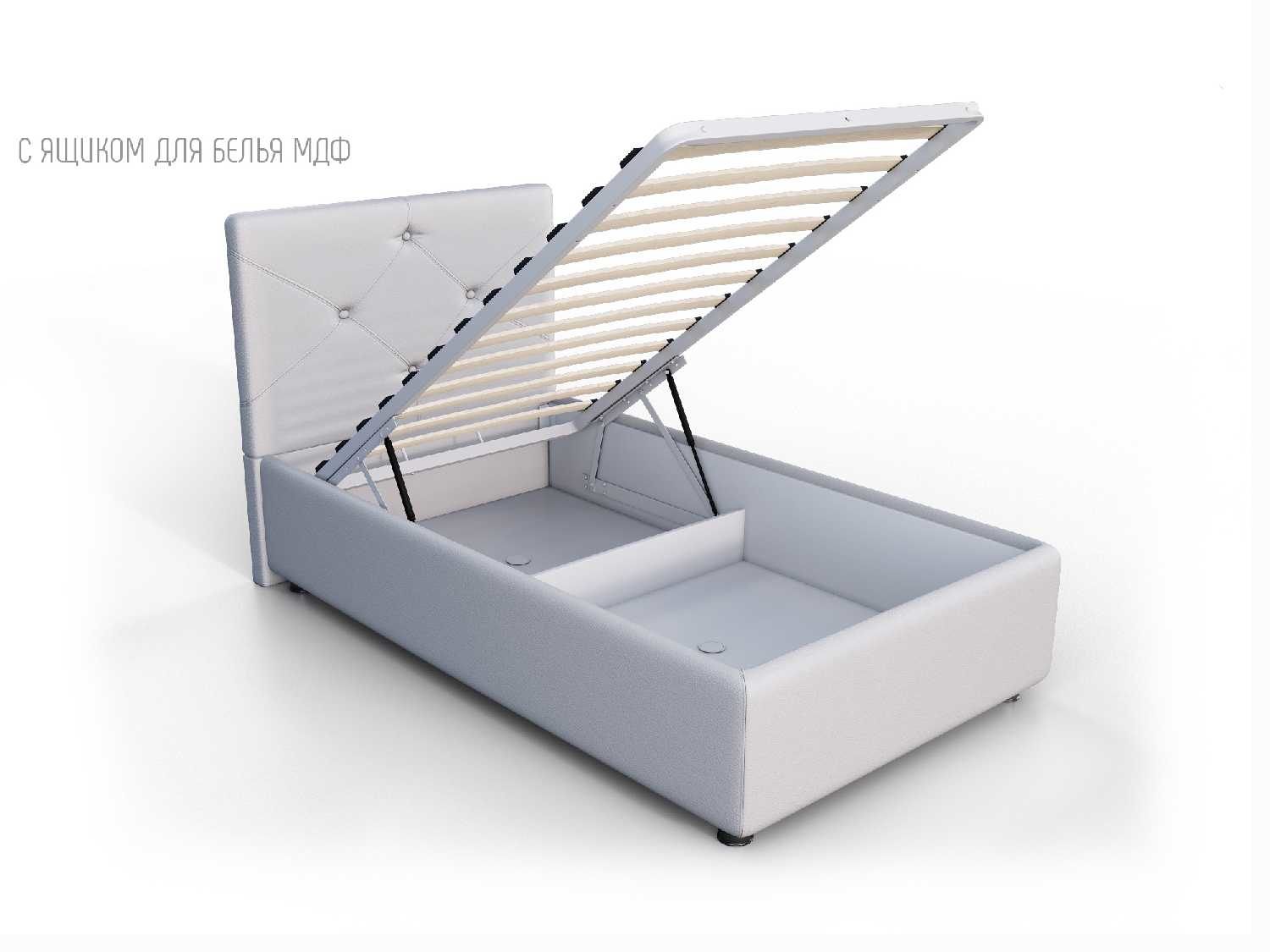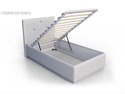 Кровать укомплектована IQ с подъемным механизмом и ящиком для белья без дна (дополнительная платная опция - дно к ящику IQ из HDF (ХДФ). Каркас кровати на цоколе, декоративный чехол на цоколе съёмный. Глубина ящика для белья - 30 см, без ограничения нагрузки на ящик.