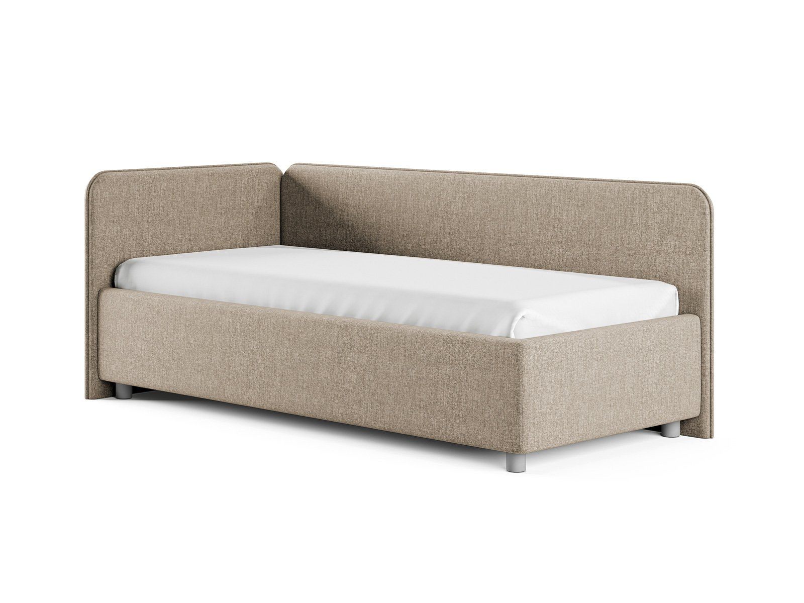 Односпальная кровать в современном стиле. Кровать-софа с одной боковой спинкой. Идеально подходит для квартир с небольшой площадью, детских и подростковых спален, гостевых комнат. Боковую спинку кровати можно изготовить на выбор на правую или левую сторону. Модель изготовлена из ДСП. При необходимости, кровать можно укомплектовать подъемным механизмом с бельевым ящиком.