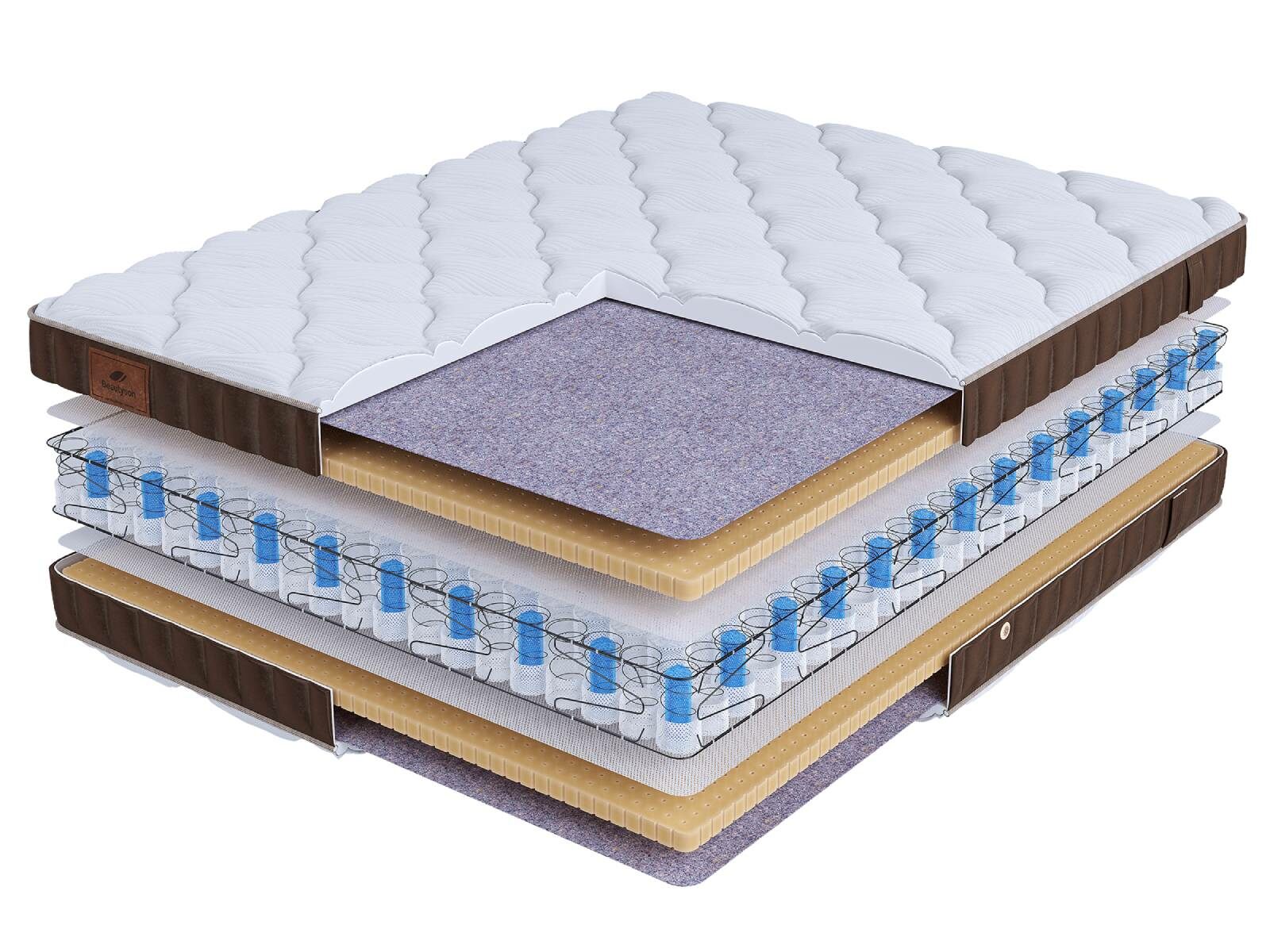 Хлопковая трикотажная ткань чехла обеспечивает комфорт и обладает отличной воздухопроницаемостью. Высокообъемная стежка с использованием холлофайбера (600гр.) подарит дополнительный комфорт спальному месту. Изысканный бурлет из мягкого велюра красивого бежевого цвета придает матрасу роскошный внешний вид и подчеркивает его премиальный статус. Каждая модель серии LIFE украшена фирменной кожаной биркой BeautySon, подтверждающая исключительность каждого матраса.
