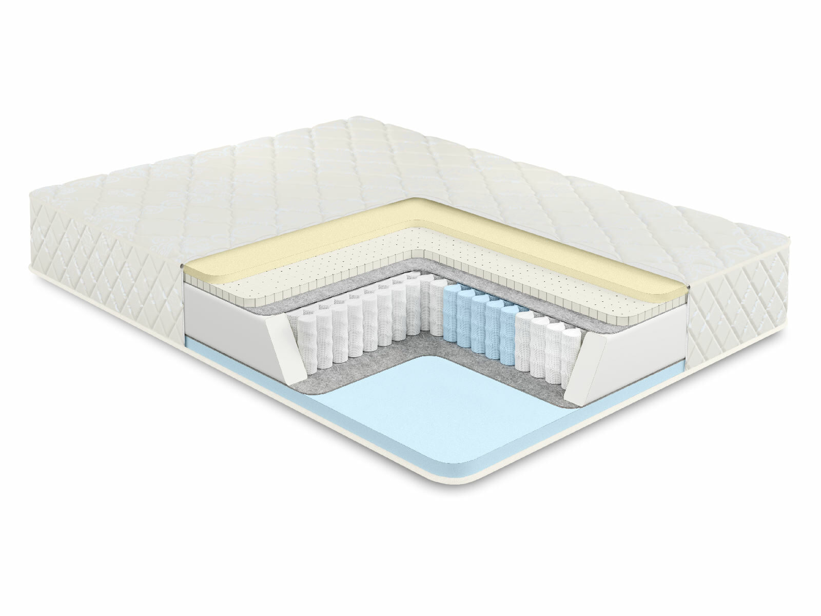 Пружинный матрас в основе которого многозональный независимый пружинный блок 1000 пружин на спальное место обеспечивает ортопедическую поддержку и комфорт во время сна. Независимые пружины подстраиваются под формы человека, потому что каждая пружина находится в отдельном кармашке и обеспечивает равномерное распределение веса.
