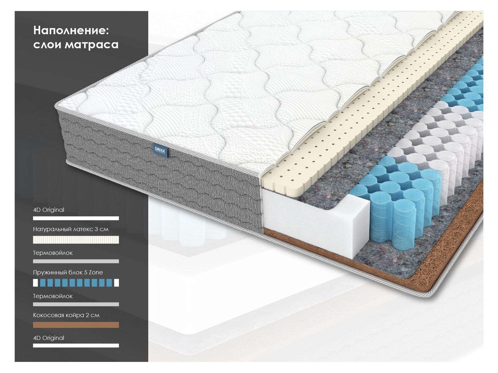 Ещё один элемент, который забирает на себя основную часть нагрузки – это независимый пружинный блок 5 Zone. Он отвечает за правильное положение человека во сне. Пружины не позволят провалиться внутрь и в то же время обеспечат анатомически верное удержание спины.