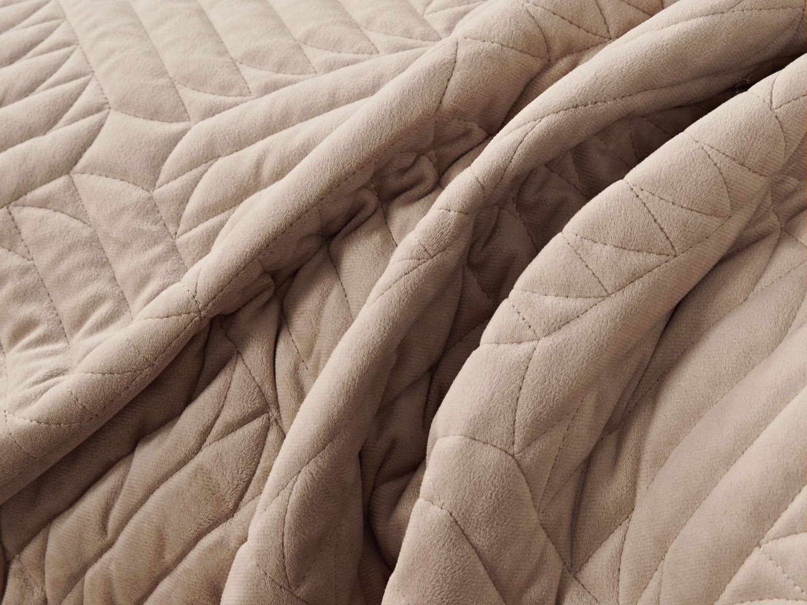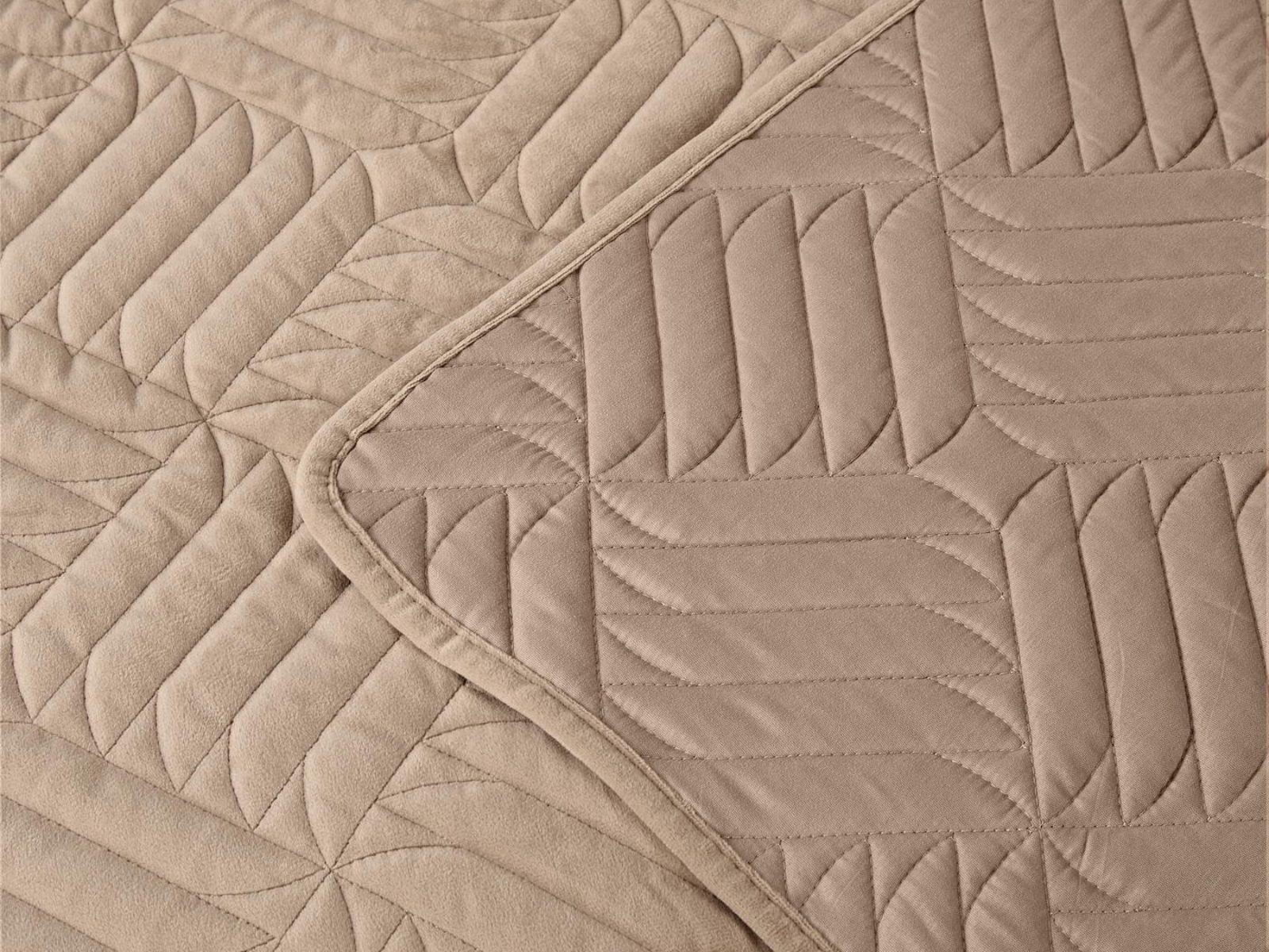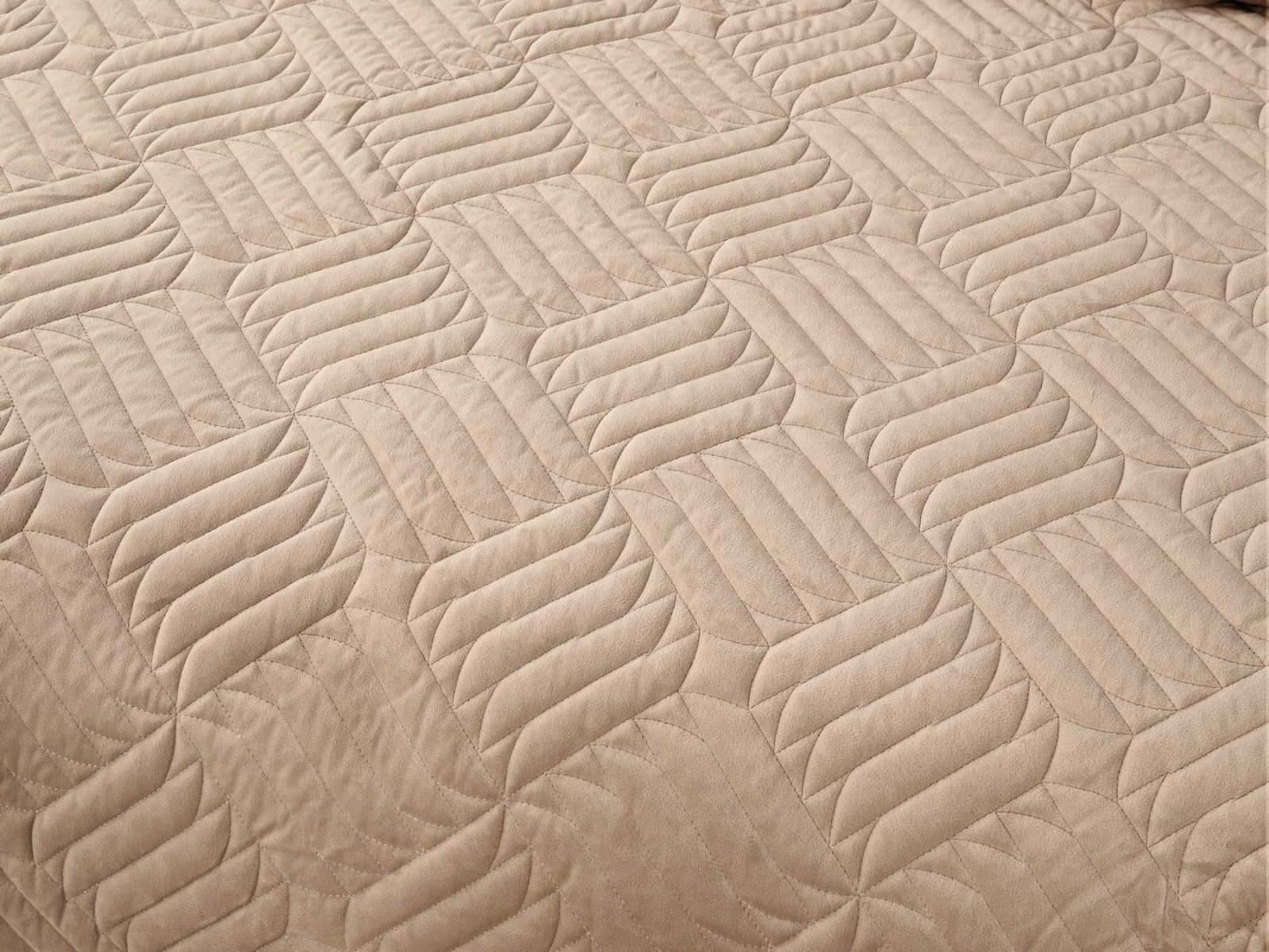 Покрывала выполнены в 10 оттенках: крем, мокко, пепельный, песочный, светло-бежевый, светло-серый, серый, темно-серый, чайная роза и черный. Стежка в виде геометрического орнамента подойдет к любому современному интерьеру. Из-за особого плетения, велюровая ткань покрывала отражает свет и красиво переливается при различном освещении.