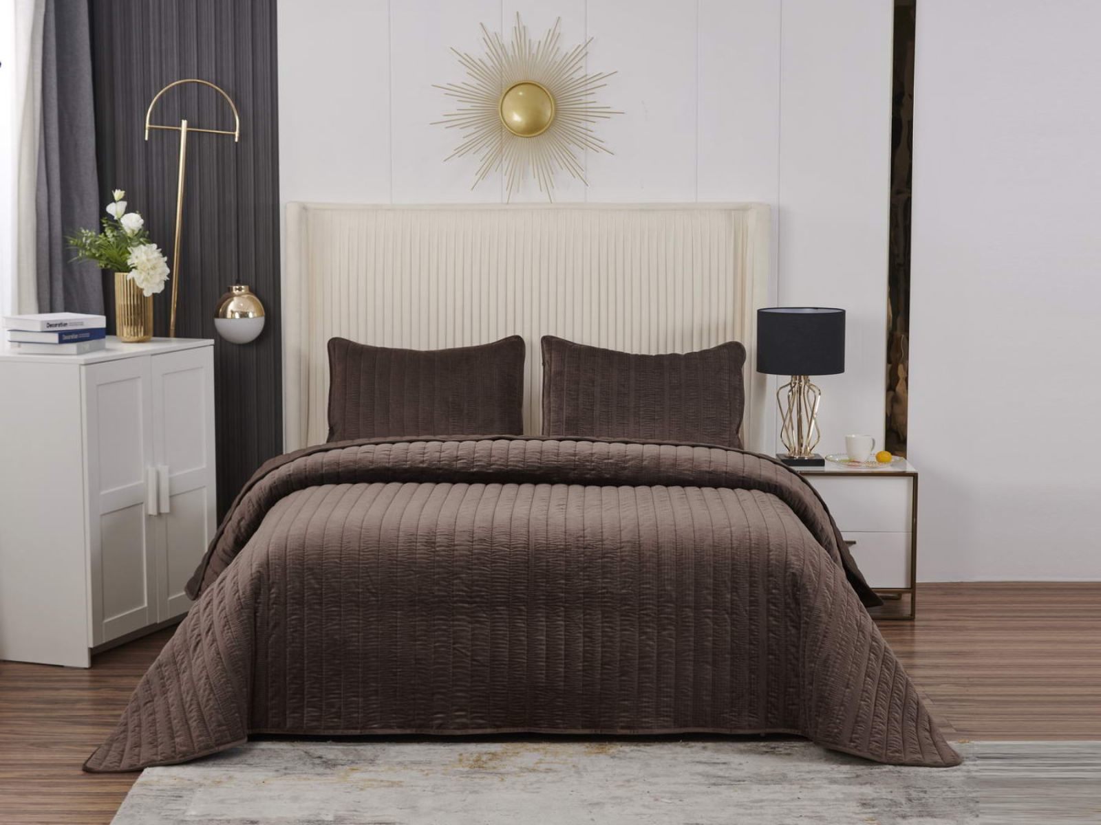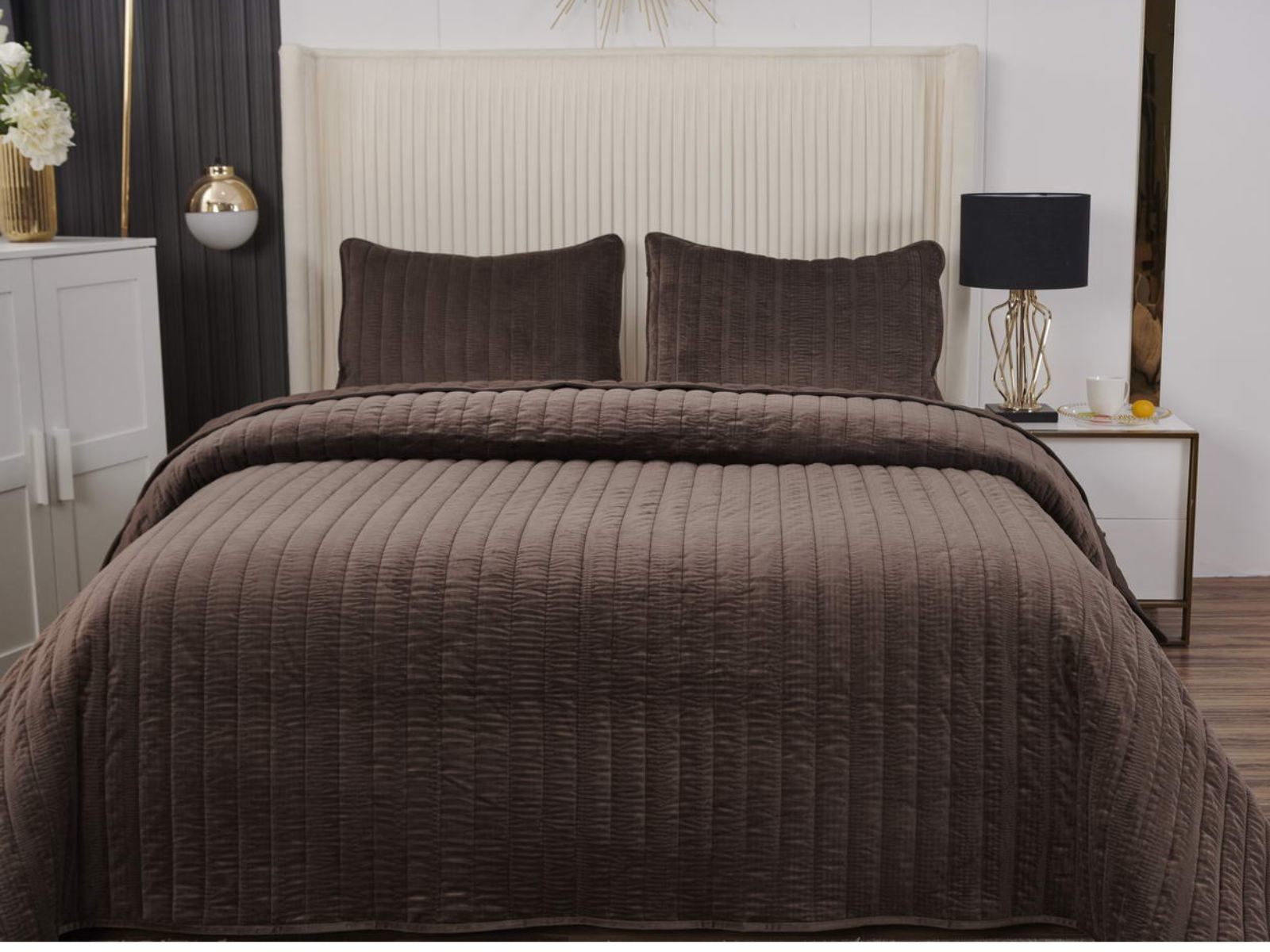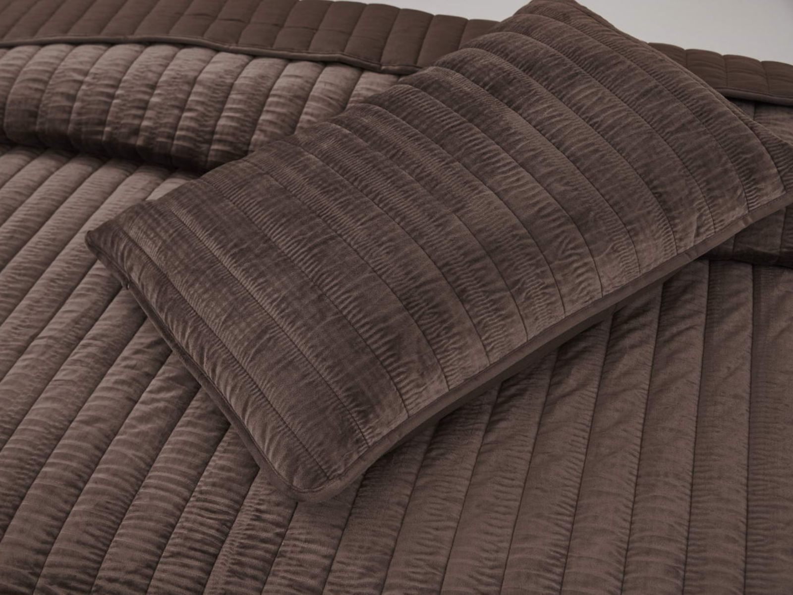Величественный вид, мягкость материала, королевская роскошь – всё это идеально описывает новое покрывало Фердинанд. Оно выполнено из велюра на основе полиэстера и представлено в оттенках: чайная роза, молоко, бежевый, кофе, стоун, серый и мокко.