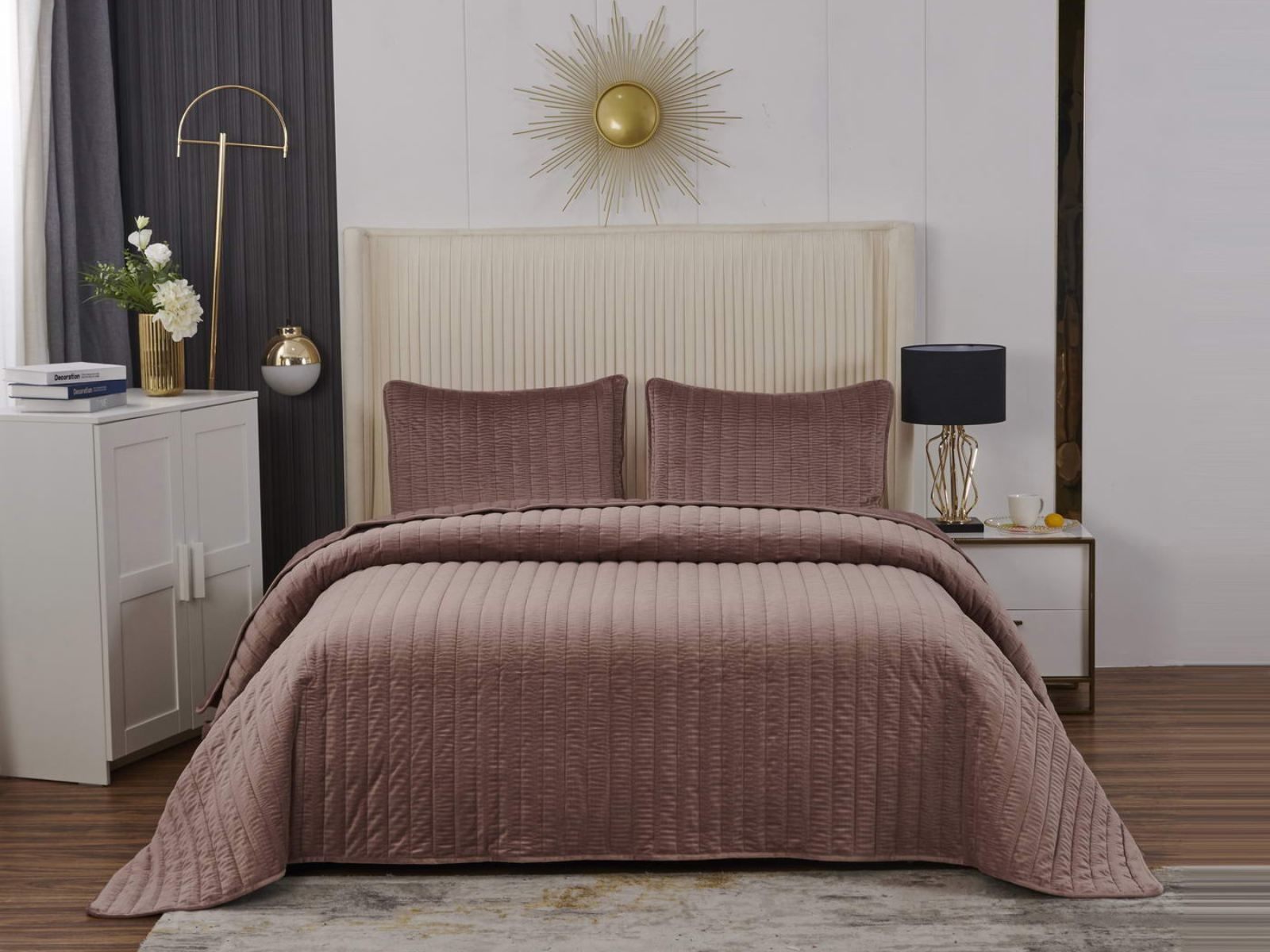Величественный вид, мягкость материала, королевская роскошь – всё это идеально описывает новое покрывало Фердинанд. Оно выполнено из велюра на основе полиэстера и представлено в оттенках: чайная роза, молоко, бежевый, кофе, стоун, серый и мокко.